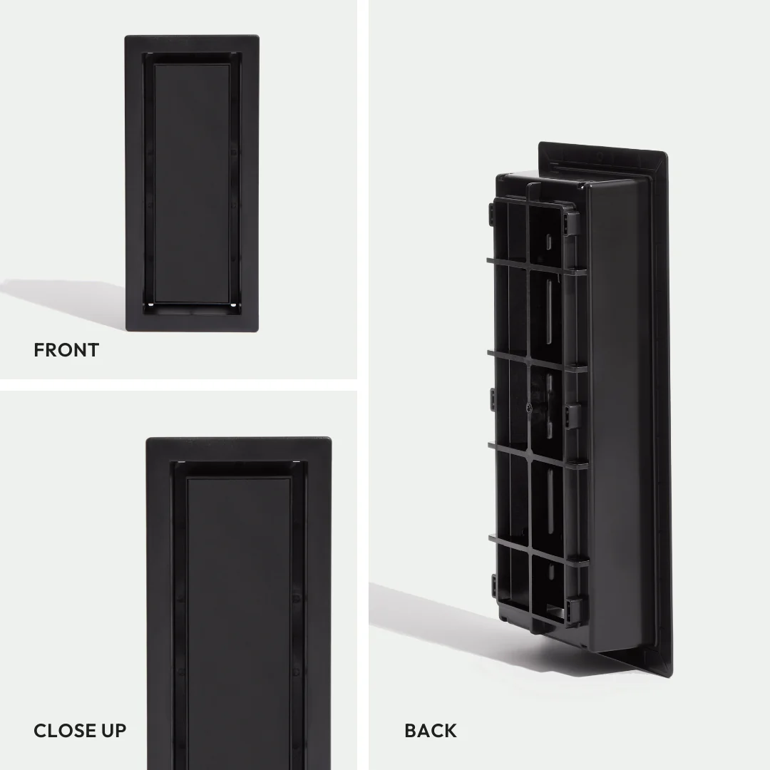 We've reimagined old-fashioned grille vents with a sleek 4"x10" design. This innovative, ultra-minimalist design instantly upgrades floors, without the need for customization. Sleek black finish compatible with all flooring surfaces. Super-easy, DIY-install in 15 minutes. Retrofit anytime. Replace with customized flooring later (or don’t — the choice is yours!) Works with all materials. HVAC-compatible.